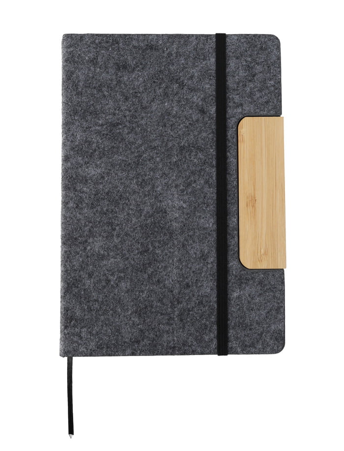 Premium A5 felt bamboo notebook featuring 80 sheets, a first information page, and a 4-year calendar. A sustainable and professional choice for corporate use and promotional gifting.